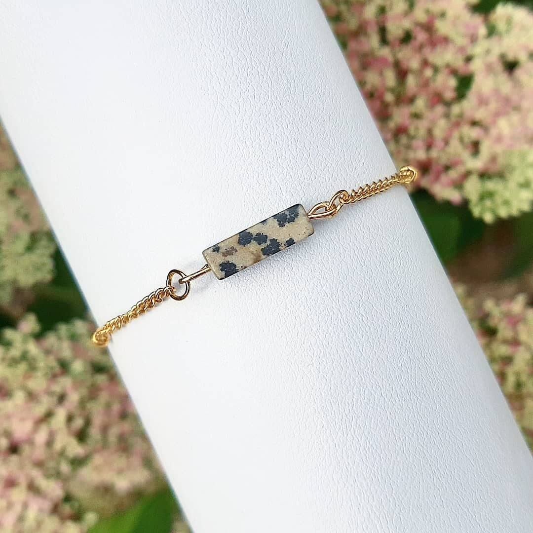 Mooi armbandje van stainless steel goud met natuursteen tube, dalmatier jaspis.