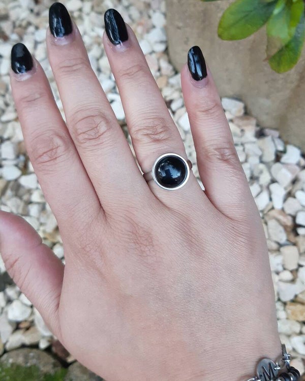 Mooie ring van stainless steel, voorzien van natuursteen cabochon 'black stone.'