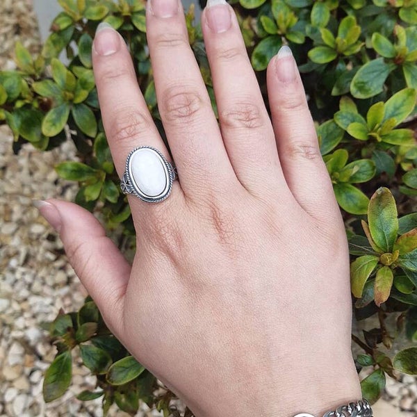 Mooie ring van sterling zilver belegd met een natuursteencabochon, witte maansteen.