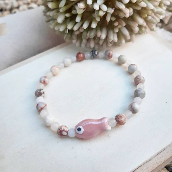 Mooie armband voorzien van natuursteenkralen en keramiek kraal visje.