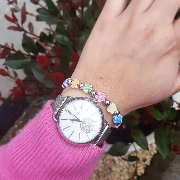 Mooie armband met stainless steel kralen en acryl bloemkralen.